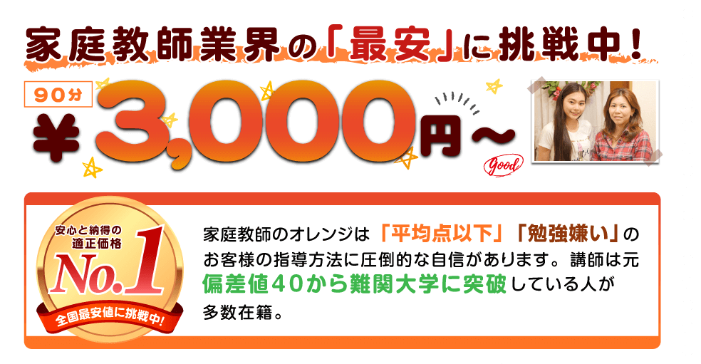 そんな中で、家庭教師のオレンジでは日本で一番安くて良い家庭教師派遣センターを目指しております。お客様からのお問い合わせ、資料請求、家庭教師の先生方からのアルバイト登録などに関しても24時間以内対応につとめております。